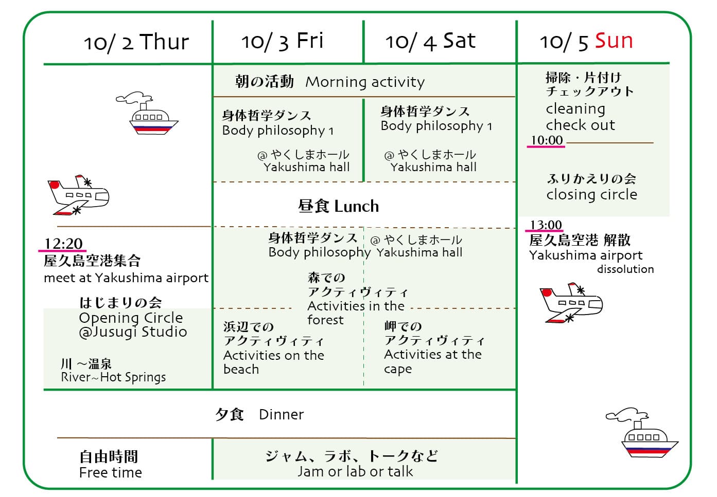 [Meeting/Disbanding] Meeting: October 2nd 12:00 Yakushima Airport Disbanding: October 5th 13:00 Yakushima Airport